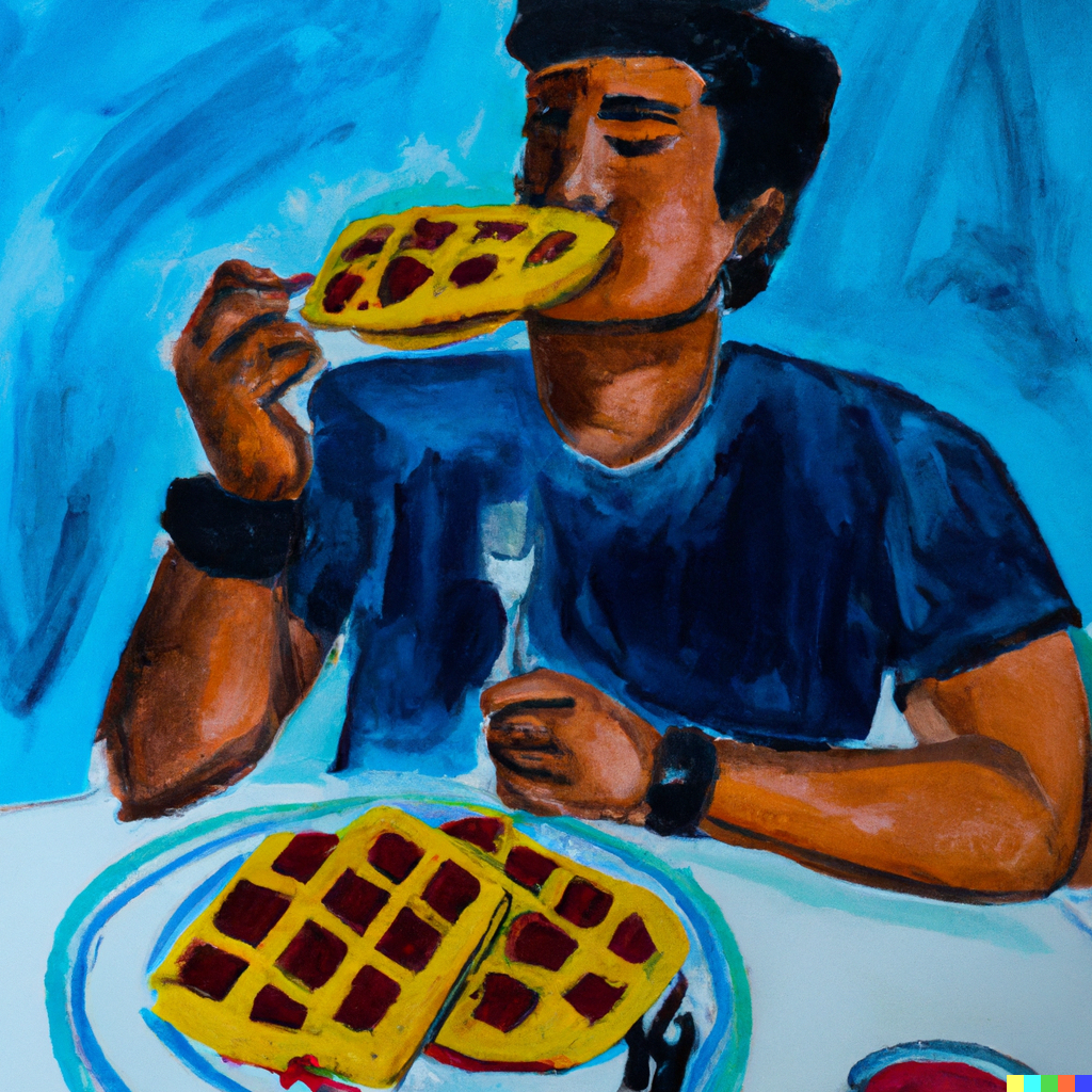 The text provided to DALL-E is quite simple, and the image reached my expectations. Besides the description, there are a few elements, like the person wearing a smartwatch and the way the person is eating the Waffles, which I thought was terrific.
