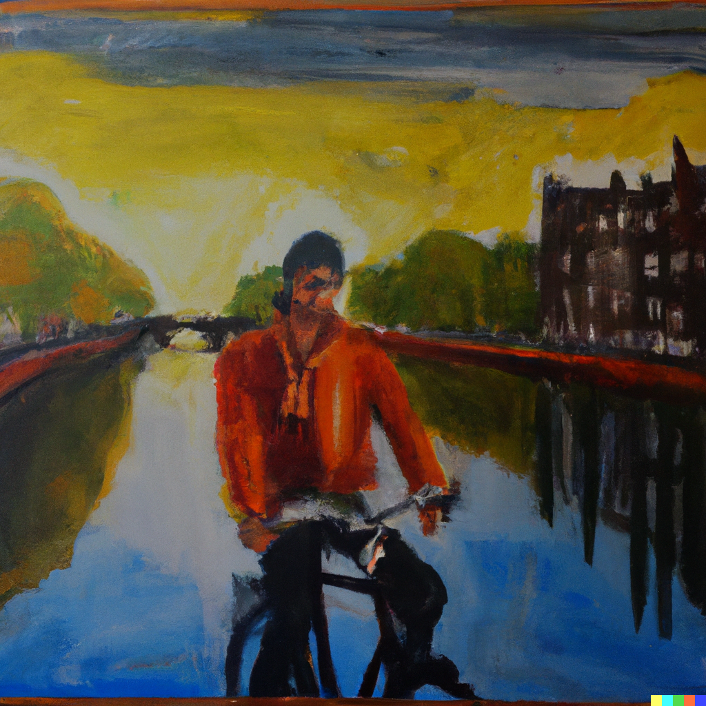 DALL-E did the job nicely here as well. DALL-E knew that canals are the most scenic places in Amsterdam and painted the subject precisely near a canal.